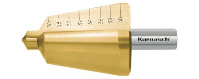 Alle Blechschälbohrer kommen mit eingelaserten Durchmessern. Blechschälbohrer sind aus hochlegiertem HSS-XE Stahl gefertigt und TIN-Gold beschichtet für eine Härte bis zu 60 HRC. TIN-Gold beschichtung für eine nochmalige Erhöhung der Standzeit auch bei Trockenarbeiten (ohne/wenig Kühlung).
